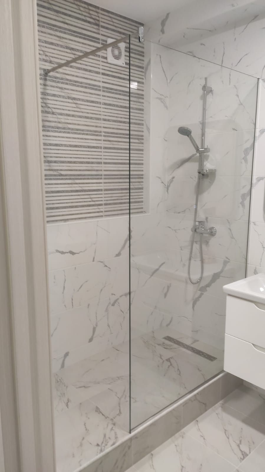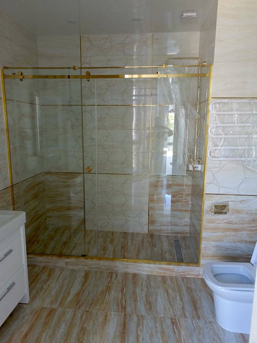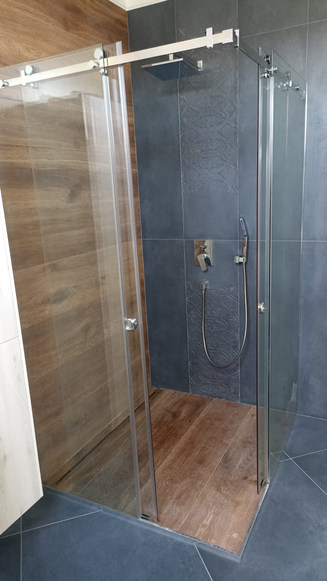 Стеклянная перегородка в душ надежно крепится к полу, стенам или поддону, не требует сложного монтажа и может быть легко собрана повторно при ремонте. Все комплектующие — от роликов до ручек — подобраны для долгой службы даже в условиях высокой влажности.