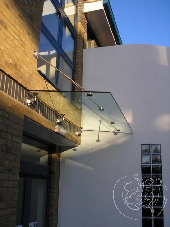 Стеклянный козырек изготавливают из закаленного стекла триплекс. Триплексация для стеклянного козырька может быть как в два стекла, так и более. Это обуславливается той нагрузкой, которую будет нести козырек из стекла. Ведь он не только придает более изящный вид зданию, но и защищает от града, снега, ветра, дождя. Стеклянный козырек — это очень прочная конструкция, способная выдержать большие нагрузки, как благодаря закаленному стеклу, так и специальным креплениям которые удерживают его.