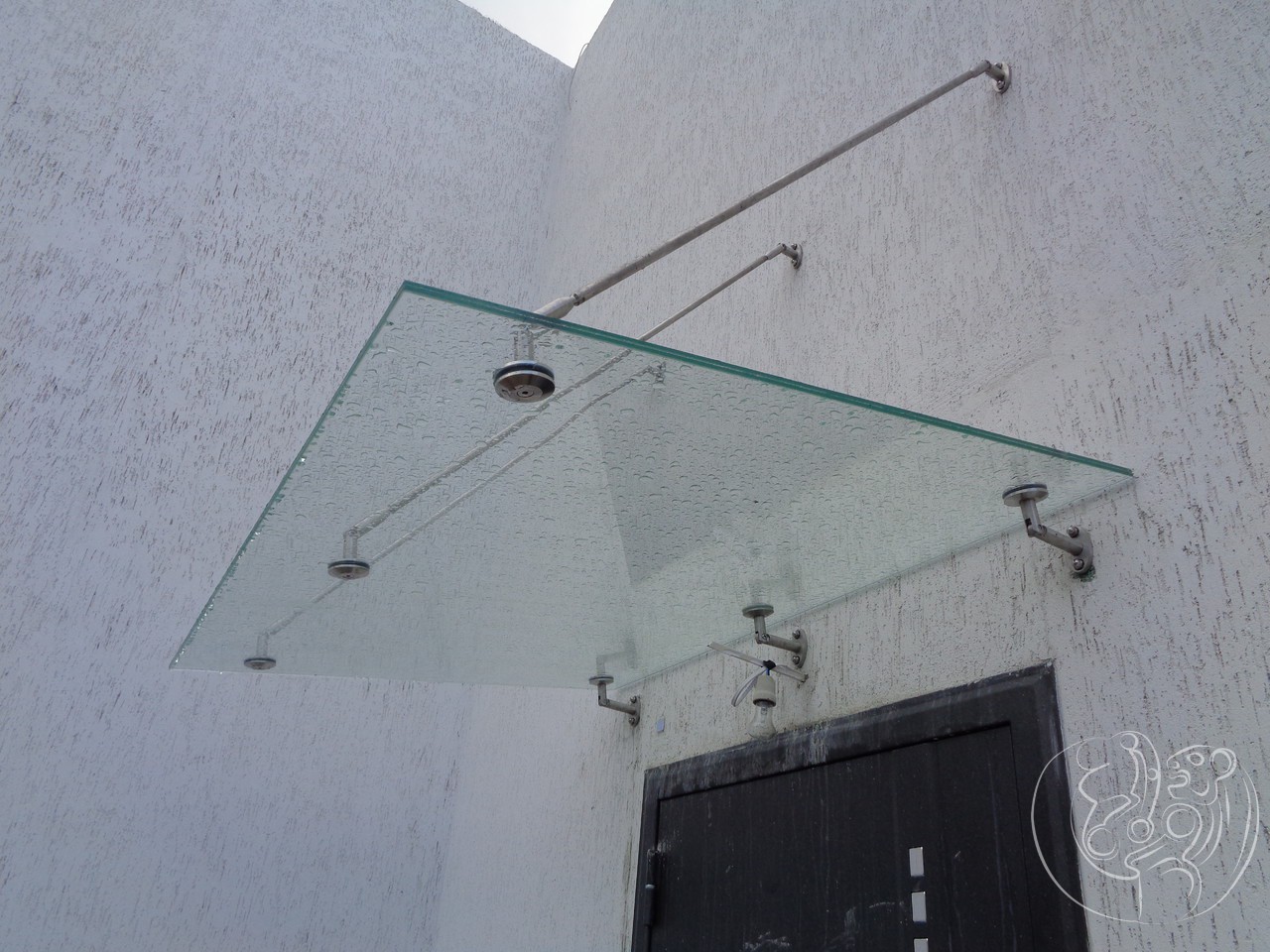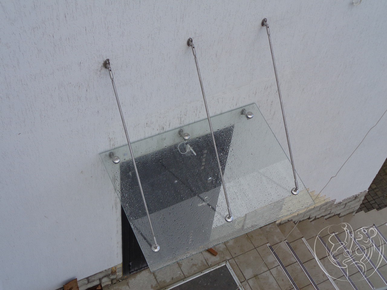 Стеклянный козырек изготавливают из закаленного стекла триплекс. Триплексация для стеклянного козырька может быть как в два стекла, так и более. Это обуславливается той нагрузкой, которую будет нести козырек из стекла. Ведь он не только придает более изящный вид зданию, но и защищает от града, снега, ветра, дождя. Стеклянный козырек — это очень прочная конструкция, способная выдержать большие нагрузки, как благодаря закаленному стеклу, так и специальным креплениям которые удерживают его.